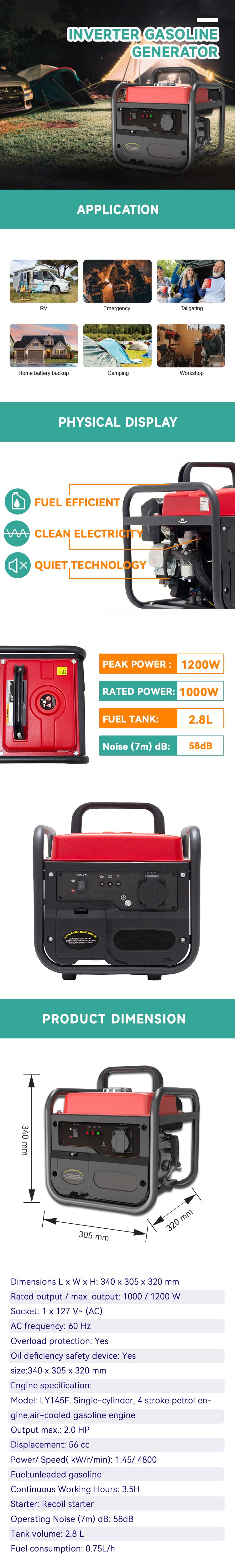 Dimensions L x W x H: 340 x 305 x 320 mm Rated output / max. output: 1000 / 1200 W Socket: 1 x 220V/110V~ (AC) AC frequency: 60 Hz Overload protection: Yes Oil deficiency safety device: Yes size:340 x 305 x 320 mm Engine specification: Model: LY145F. Single-cylinder, 4 stroke petrol engine,air-cooled gasoline engine Output max.: 2.0 HP Displacement: 56 cc Power/ Speed( kW/r/min): 1.45/ 4800 Fuel:unleaded gasoline Continuous Working Hours: 3.5H Starter: Recoil starter Operating Noise (7m) dB: 58dB Tank volume: 2.8 L Fuel consumption: 0.75L/h