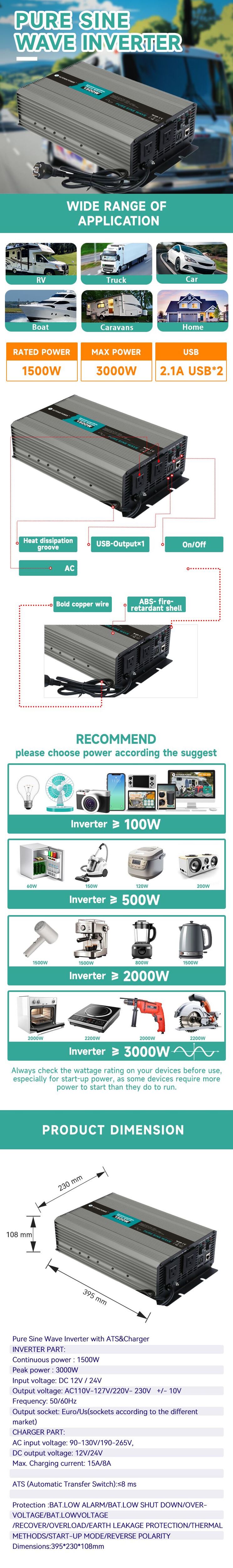 Pure Sine Wave Inverter with ATS&Charger INVERTER PART: Continuous power : 1500W Peak power : 3000W Input voltage: DC 12V / 24V Output voltage: AC110V-127V/220V- 230V +/- 10V Frequency: 50/60Hz Output socket: Euro/Us(sockets according to the different market) CHARGER PART: AC input voltage: 90-130V/190-265V, DC output voltage: 12V/24V Max. Charging current: 15A/8A