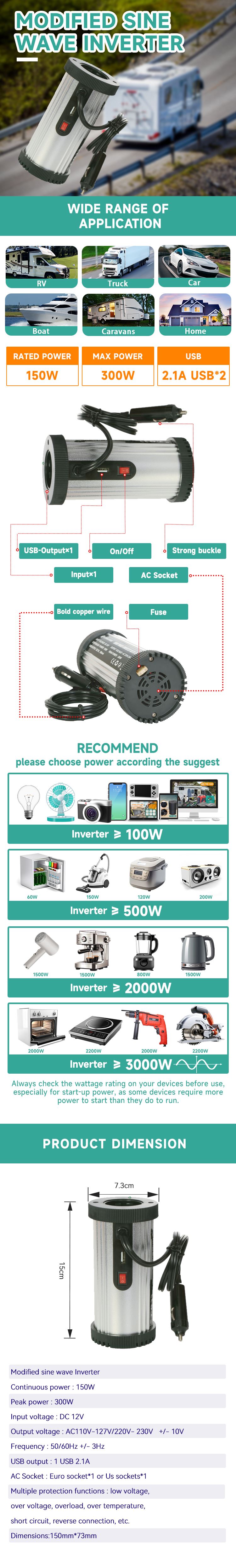 Modified sine wave Inverter Continuous power : 150W Peak power : 300W Input voltage : DC 12V Output voltage : AC110V-127V/220V- 230V +/- 10V Frequency : 50/60Hz +/- 3Hz USB output : 1 USB 2.1A AC Socket : Euro socket*1 or Us sockets*1 Multiple protection functions : low voltage, over voltage, overload, over temperature, short circuit, reverse connection, etc.