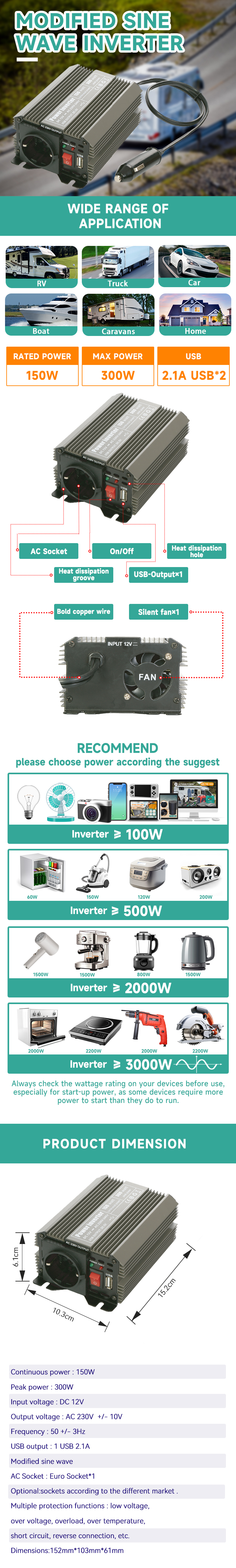Continuous power : 150W Peak power : 300W Input voltage : DC 12V Output voltage : AC 230V +/- 10V Frequency : 50 +/- 3Hz USB output : 1 USB 2.1A Modified sine wave AC Socket : Euro Socket*1 Optional:sockets according to the different market . Multiple protection functions : low voltage, over voltage, overload, over temperature, short circuit, reverse connection, etc.