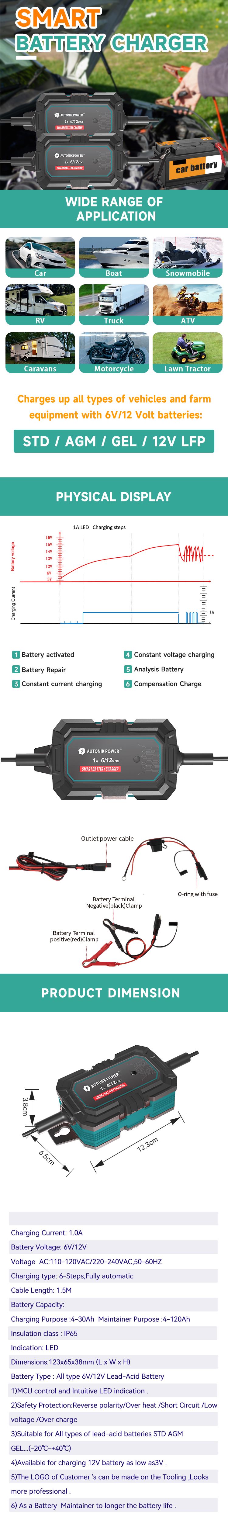 Charging Current: 1.0A Battery Voltage: 6V/12V Voltage AC:110-120VAC/ 220-240VAC,50-60HZ Charging type: 6-Steps,Fully automatic Cable Length: 1.5M Battery Capacity: Charging Purpose :4-30Ah Maintainer Purpose :4-120Ah Insulation class : IP65 Indication: LED Battery Type : All type 6V/12V Lead-Acid Battery 1)MCU control and Intuitive LED indication . 2)Safety Protection:Reverse polarity/Over heat /Short Circuit /Low voltage /Over charge 3)Suitable for All types of lead-acid batteries STD AGM GEL...(-20℃-+40℃) 4)Available for charging 12V battery as low as3V . 5)The LOGO of Customer 's can be made on the Tooling ,Looks more professional . 6) As a Battery Maintainer to longer the battery life .