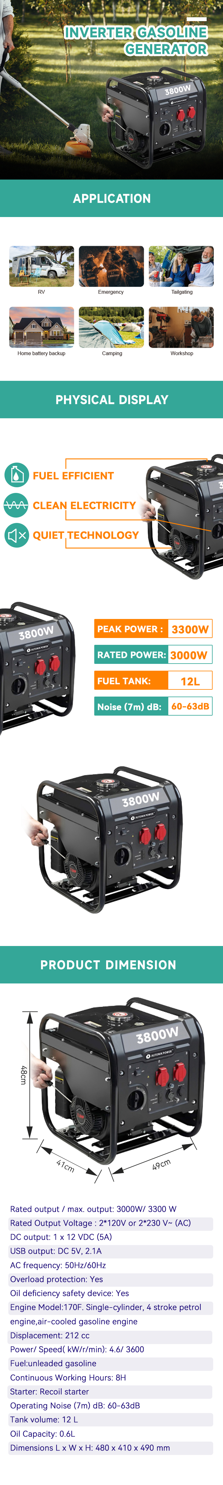 Rated output / max. output: 3000W/ 3300 W Rated Output Voltage : 2*120V or 2*230 V~ (AC) DC output: 1 x 12 VDC (5A) USB output: DC 5V, 2.1A AC frequency: 50Hz/60Hz Overload protection: Yes Oil deficiency safety device: Yes Engine Model:170F. Single-cylinder, 4 stroke petrol engine,air-cooled gasoline engine Displacement: 212 cc Power/ Speed( kW/r/min): 4.6/ 3600 Fuel:unleaded gasoline Continuous Working Hours: 8H Starter: Recoil starter Operating Noise (7m) dB: 60-63dB Tank volume: 12 L Oil Capacity: 0.6L Dimensions L x W x H: 480 x 410 x 490 mm