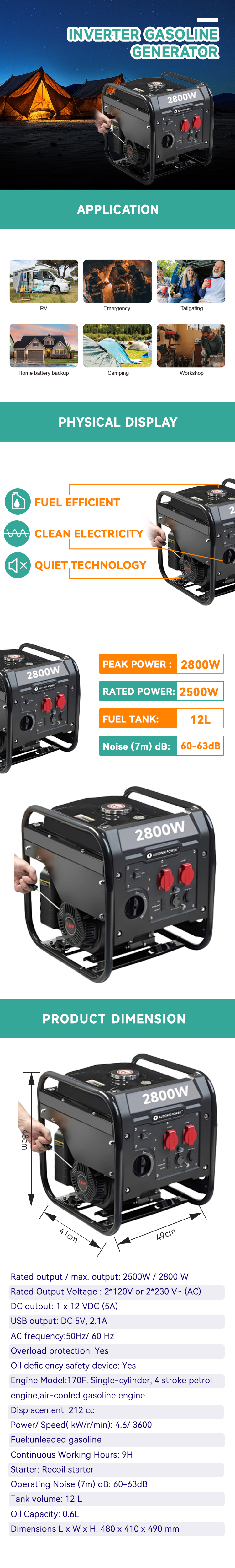 Rated output / max. output: 2500W / 2800 W Rated Output Voltage : 2*120V or 2*230 V~ (AC) DC output: 1 x 12 VDC (5A) USB output: DC 5V, 2.1A AC frequency:50Hz/ 60 Hz Overload protection: Yes Oil deficiency safety device: Yes Engine Model:170F. Single-cylinder, 4 stroke petrol engine,air-cooled gasoline engine Displacement: 212 cc Power/ Speed( kW/r/min): 4.6/ 3600 Fuel:unleaded gasoline Continuous Working Hours: 9H Starter: Recoil starter Operating Noise (7m) dB: 60-63dB Tank volume: 12 L Oil Capacity: 0.6L Dimensions L x W x H: 480 x 410 x 490 mm