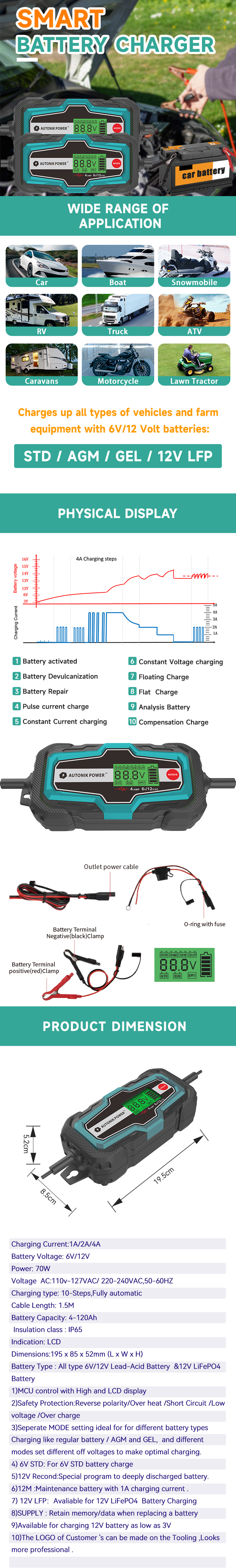 Charging Current:1A/2A/4A Battery Voltage: 6V/12V Power: 70W Voltage AC:110v-127VAC/ 220-240VAC,50-60HZ Charging type: 10-Steps,Fully automatic Cable Length: 1.5M Battery Capacity: 4-120Ah Insulation class : IP65 Indication: LCD Battery Type : All type 6V/12V Lead-Acid Battery &12V LiFePO4 Battery 1)MCU control with High and LCD display 2)Safety Protection:Reverse polarity/Over heat /Short Circuit /Low voltage /Over charge 3)Seperate MODE setting ideal for for different battery types Charging like regular battery / AGM and GEL, and different modes set different off voltages to make optimal charging. 4) 6V STD: For 6V STD battery charge 5)12V Recond:Special program to deeply discharged battery. 6)12M :Maintenance battery with 1A charging current . 7) 12V LFP:Avaliable for 12V LiFePO4 Battery Charging 8)SUPPLY : Retain memory/data when replacing a battery 9)Available for charging 12V battery as low as 3V 10)The LOGO of Customer 's can be made on the Tooling ,Looks more professional .