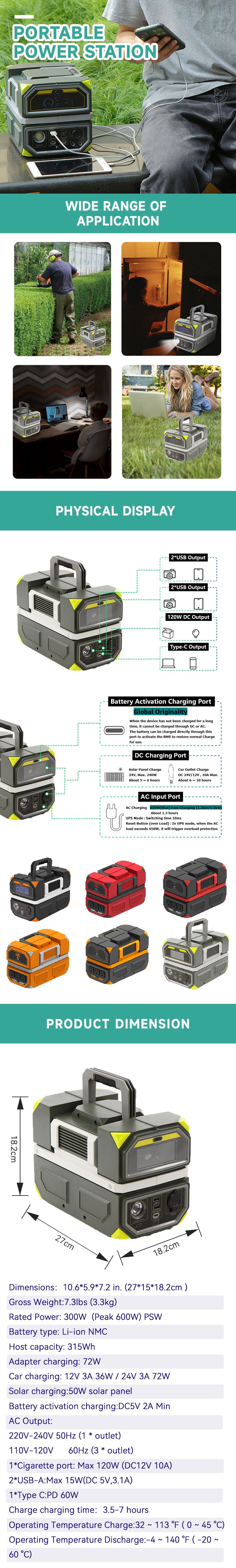 .LCD Display .Program controlled inverter, output voltage and frequency kept high consistency .Temperature controlled fan, automatic speed regulation .BMS protection:Over Current / Short Current / Over-Discharge / Overcharge / Over Voltage / Over Temperature .Inverter protection:Under Voltage / Over Voltage / Short Circuit / Overload / Over Temperature .Accessories: 1*AC Adapter 1*Car charging cable 1*Solar charging cable CE-EMC/LVD, RoHS, C-MET-US, FCC, UN38.3, MSDS