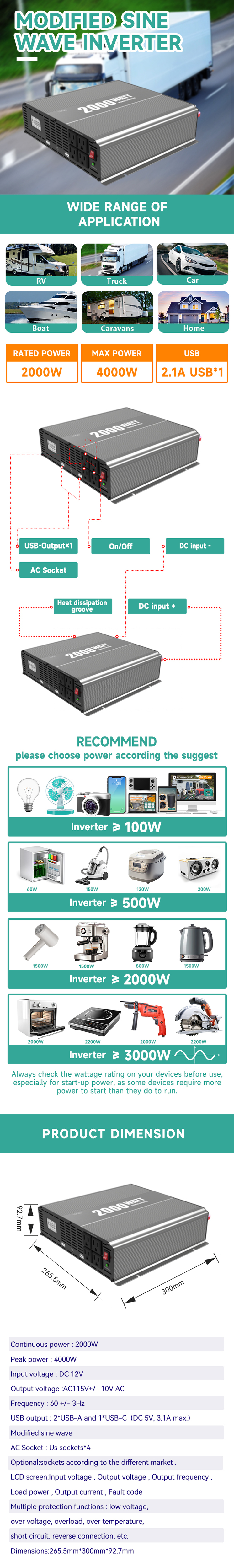 Continuous power : 2000W Peak power : 4000W Input voltage : DC 12V Output voltage :AC115V+/- 10V AC Frequency : 60 +/- 3Hz USB output : 2*USB-A and 1*USB-C (DC 5V, 3.1A max.) Modified sine wave AC Socket : Us sockets*4 Optional:sockets according to the different market . LCD screen:Input voltage , Output voltage , Output frequency , Load power , Output current , Fault code Multiple protection functions : low voltage, over voltage, overload, over temperature, short circuit, reverse connection, etc.