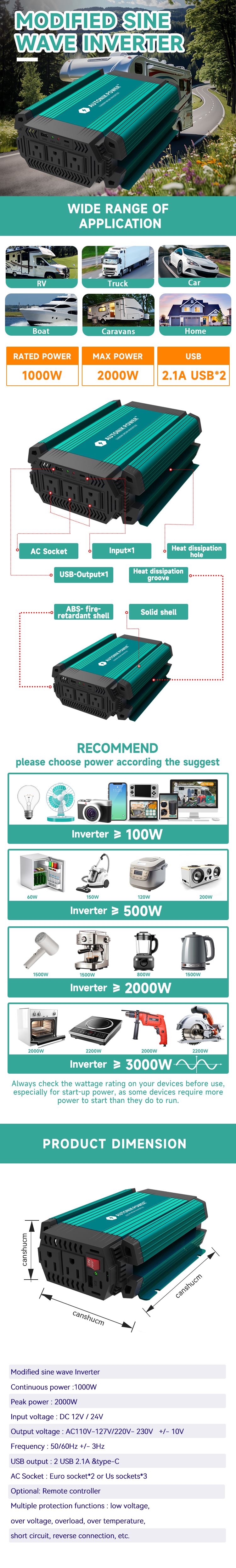 Modified sine wave Inverter Continuous power :1000W Peak power : 2000W Input voltage : DC 12V / 24V Output voltage : AC110V-127V/220V- 230V +/- 10V Frequency : 50/60Hz +/- 3Hz USB output : 2 USB 2.1A &type-C AC Socket : Euro socket*2 or Us sockets*3 Optional: Remote controller Multiple protection functions : low voltage, over voltage, overload, over temperature, short circuit, reverse connection, etc.