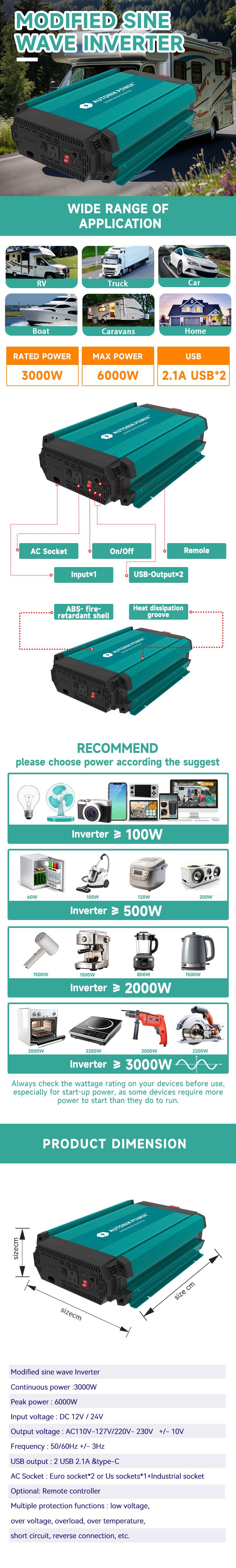 Modified sine wave Inverter Continuous power :3000W Peak power : 6000W Input voltage : DC 12V / 24V Output voltage : AC110V-127V/220V- 230V +/- 10V Frequency : 50/60Hz +/- 3Hz USB output : 2 USB 2.1A &type-C AC Socket : Euro socket*2 or Us sockets*1+Industrial socket Optional: Remote controller Multiple protection functions : low voltage, over voltage, overload, over temperature, short circuit, reverse connection, etc.