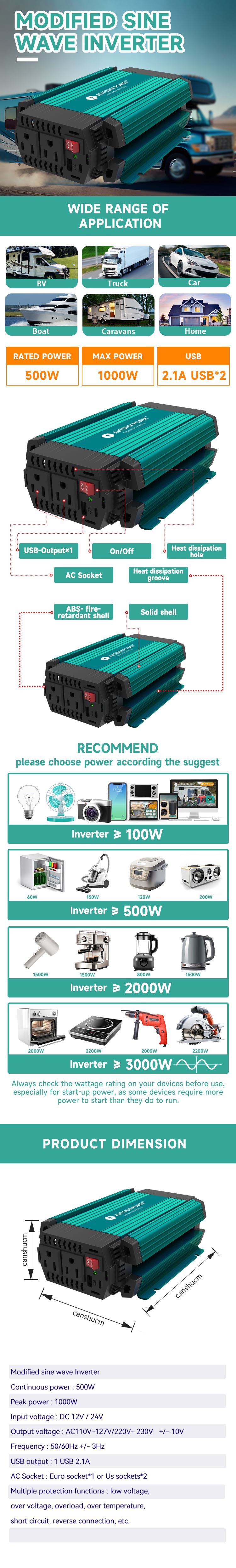 Modified sine wave Inverter Continuous power : 500W Peak power : 1000W Input voltage : DC 12V / 24V Output voltage : AC110V-127V/220V- 230V +/- 10V Frequency : 50/60Hz +/- 3Hz USB output : 1 USB 2.1A AC Socket : Euro socket*1 or Us sockets*2 Multiple protection functions : low voltage, over voltage, overload, over temperature, short circuit, reverse connection, etc.