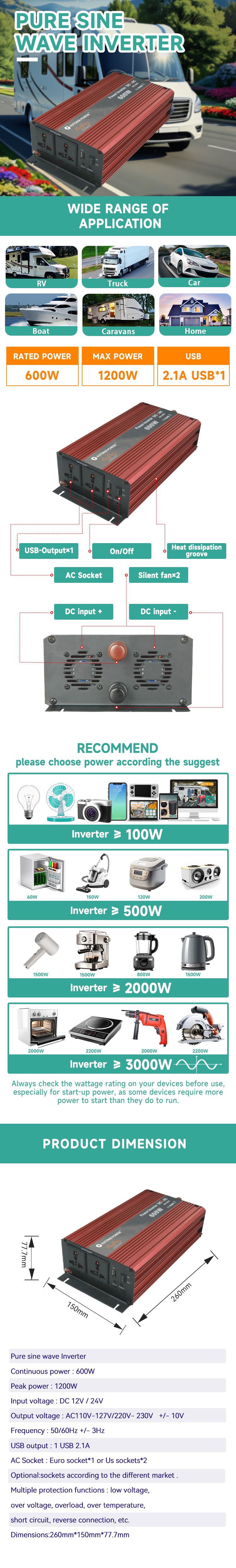 Pure sine wave Inverter Continuous power : 600W Peak power : 1200W Input voltage : DC 12V / 24V Output voltage : AC110V-127V/220V- 230V +/- 10V Frequency : 50/60Hz +/- 3Hz USB output : 1 USB 2.1A AC Socket : Euro socket*1 or Us sockets*2 Optional:sockets according to the different market . Multiple protection functions : low voltage, over voltage, overload, over temperature, short circuit, reverse connection, etc.